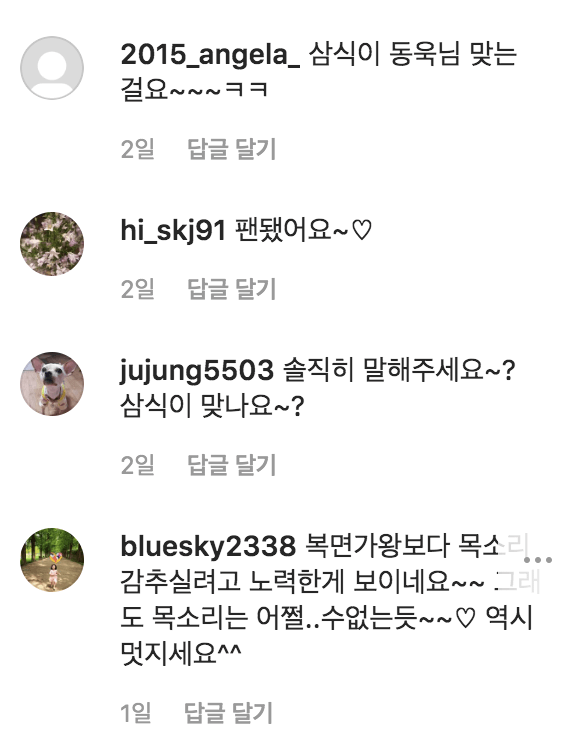 하지만 팬들은 "팬됐어요~♡, 솔직히 말해주세요~? 삼식이 맞나요~?, 삼식이 동욱님 맞는 걸요~~~ㅋㅋ"라며 여전히 의심을 하고 있습니다. JK김동욱은 복면가왕에 출연한적이 있으며 복면가왕에서도 본인이 아니라고 발뺌했지만 결국 네티즌들의 뇌피셜이 들어맞은 적이 있습니다.